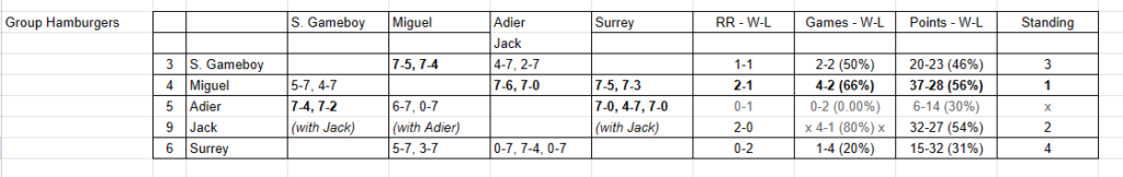 So far, it has been a crazy round of Round Robin matches so far! Three of our semifinal spots have been decided and only one remains. Jack and S. Gameboy are the two candidates to make the spot happen. A single match against Surrey vs. S. Gameboy, controls the fate. Miguel claimed the first spot for Group Hamburgers.