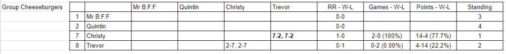 S. Gameboy and Surrey is busy because of scheduling but will be eventally paired up with his opening Round Robin match. Group Cheeseburger players Mr B.F.F will be set to play with Trevor while Quintin debuts with Christy on their respective Round Robin matches next.