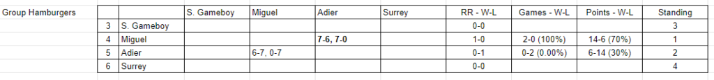 Miguel will be set to play either Surrey (over the weekend) or S. Gameboy next to see if he can find some more points in his next two Round Robin matches.