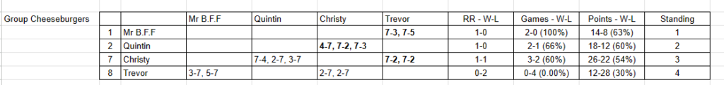 Group Cheeseburgers is bound to complete their Group Stage matches. All players from that group will be now switching to their next Round Robin matches. The final match in that Group. It will be a Showdown against Mr B.F.F and Quintin once we get there.