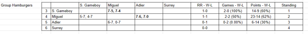Another match was played today in the WSC Tennis Court. S. Gameboy began his campaign by winning his first round robin match against Miguel. He will be playing against Alternate Jack who replaced Adier who had withdrawn, two days ago.